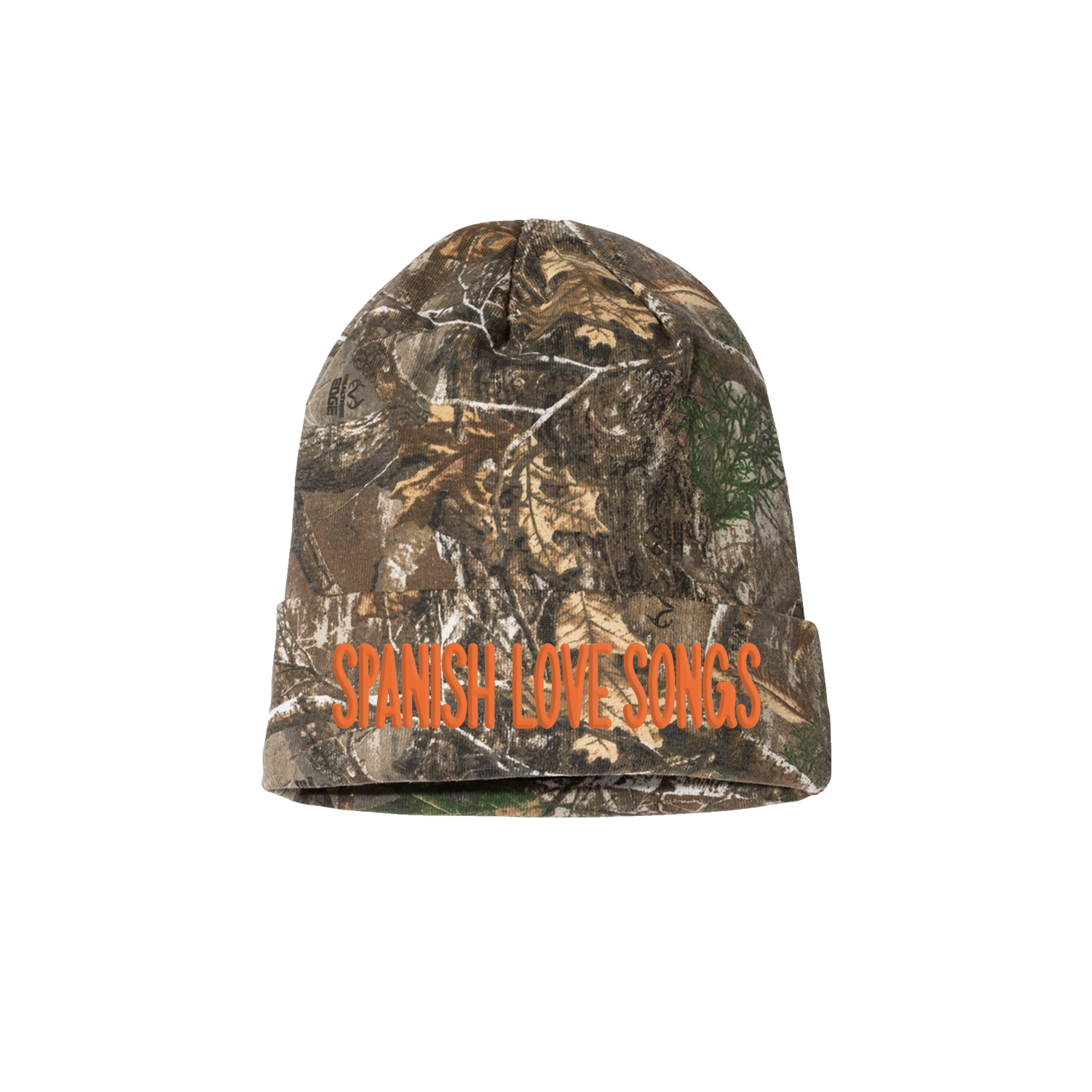 The Spanish Love Songs design, embroidered on a realtree camo cuffed beanie.